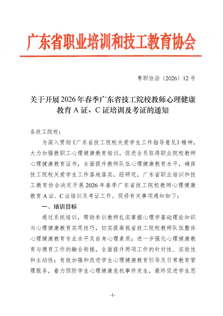 关于开展2026 年春季广东省技工院校教师心理健康教育A 证、C 证培训及考证的通知(粤职协函〔2026〕12 号)