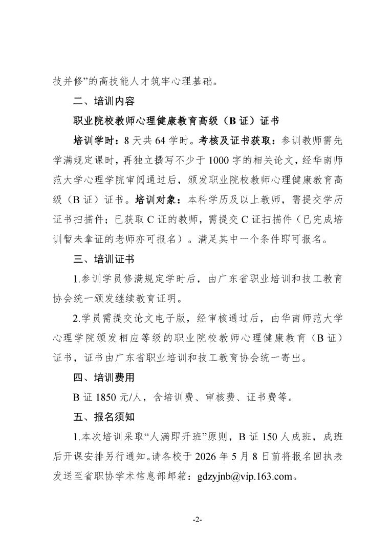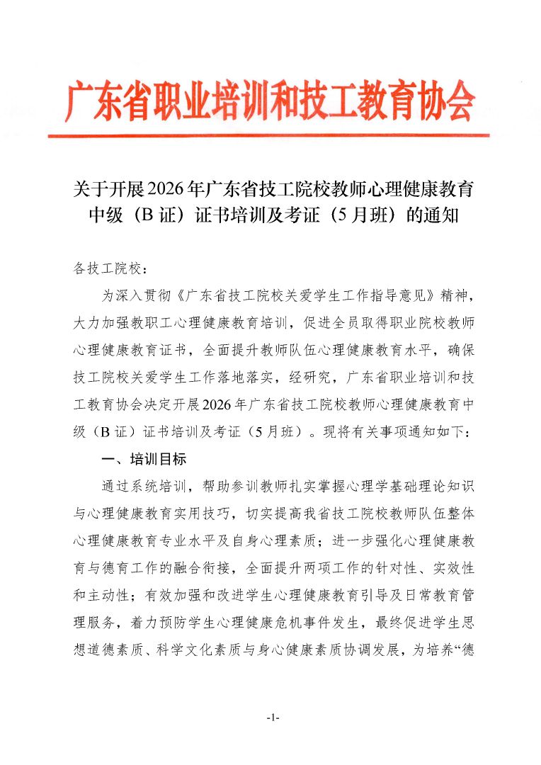 关于开展2026 年广东省技工院校教师心理健康教育中级(B 证)证书培训及考证(5 月班)的通知