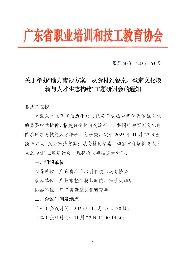 关于举办“助力南沙方案:从食材到餐桌,疍家文化焕 新与人才生态构建”主题研讨会的通知(粤职协函〔2025〕63 号)