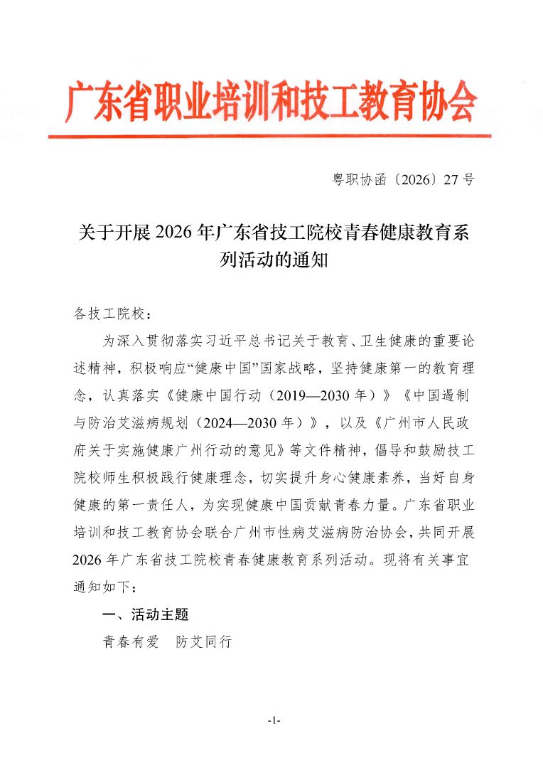 关于开展2026 年广东省技工院校青春健康教育系列活动的通知(粤职协函〔2026〕27 号)