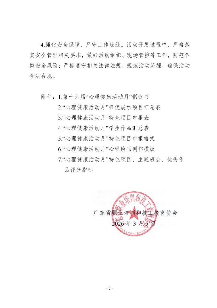 关于开展第十六届广东省技工院校“心理健康活动月”暨第十一届“心理健康活动月”特色项目推优展示活动的通知(粤职协函〔2026〕10 号)