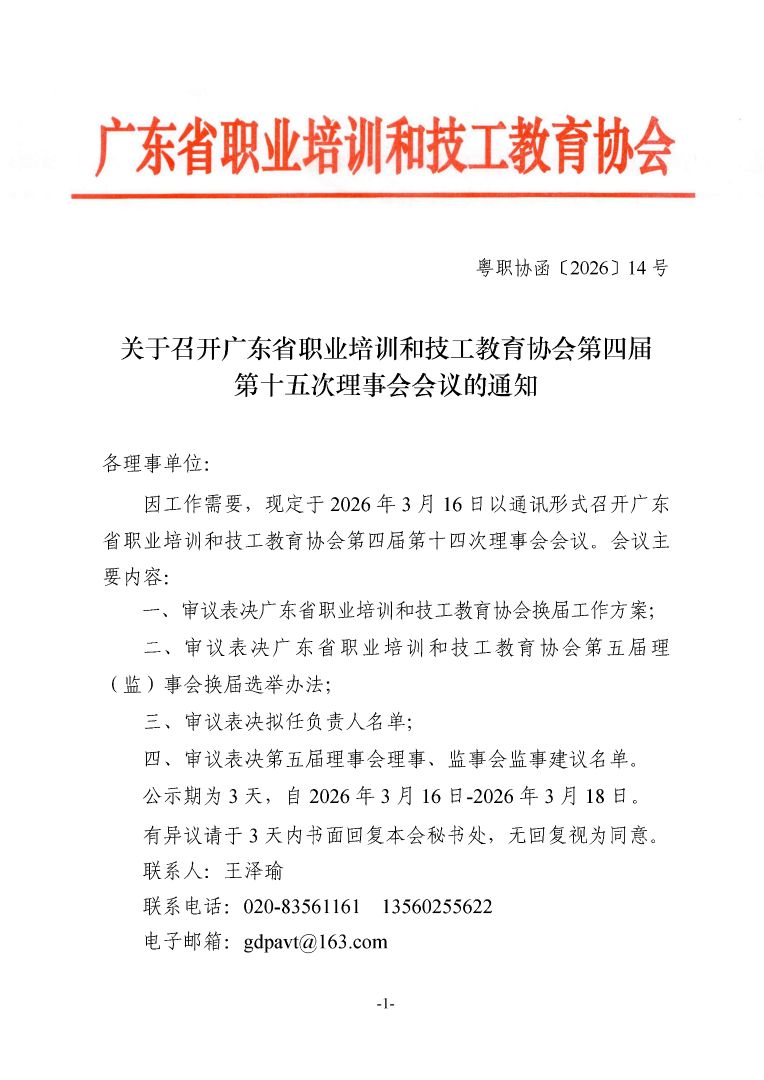 关于召开广东省职业培训和技工教育协会第四届第十五次理事会会议的通知(粤职协函〔2026〕14 号)