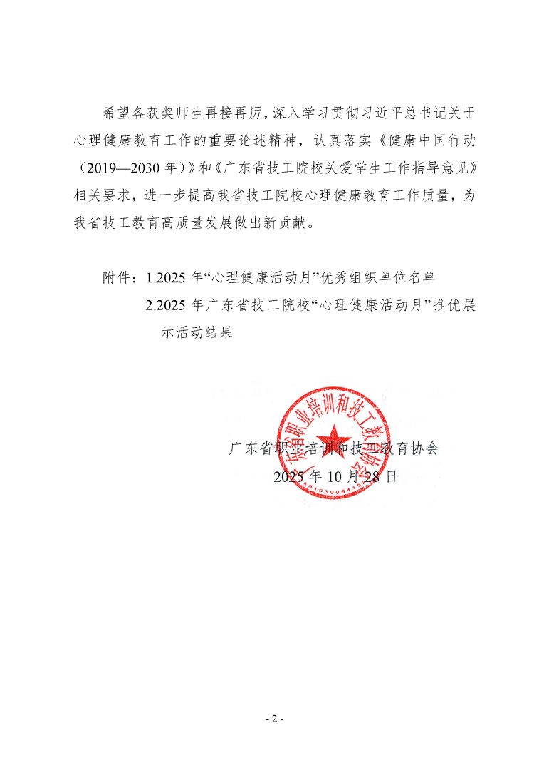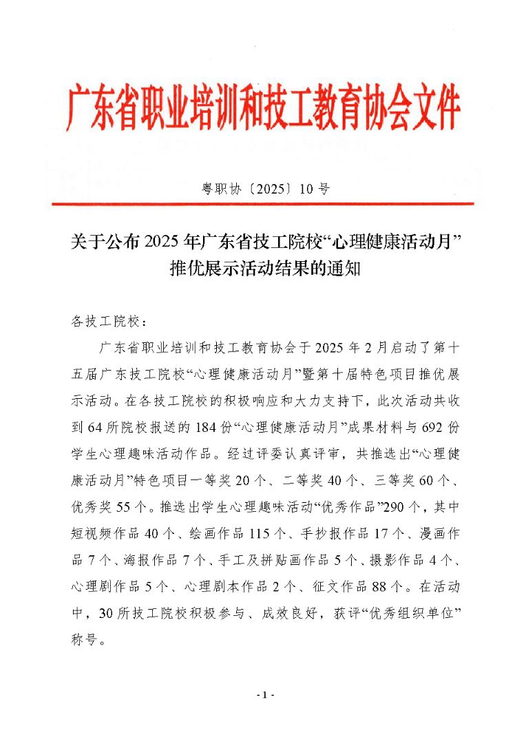 关于公布2025年广东省技工院校“心理健康活动月”推优展示活动结果的通知(粤职协〔2025〕10号)
