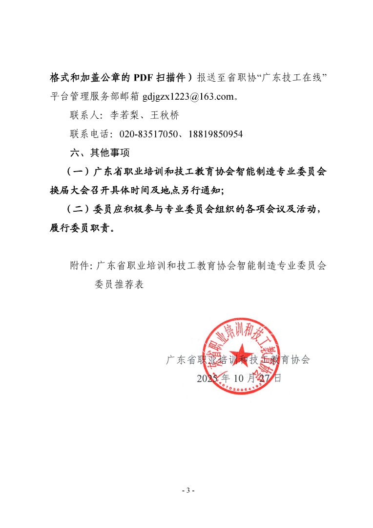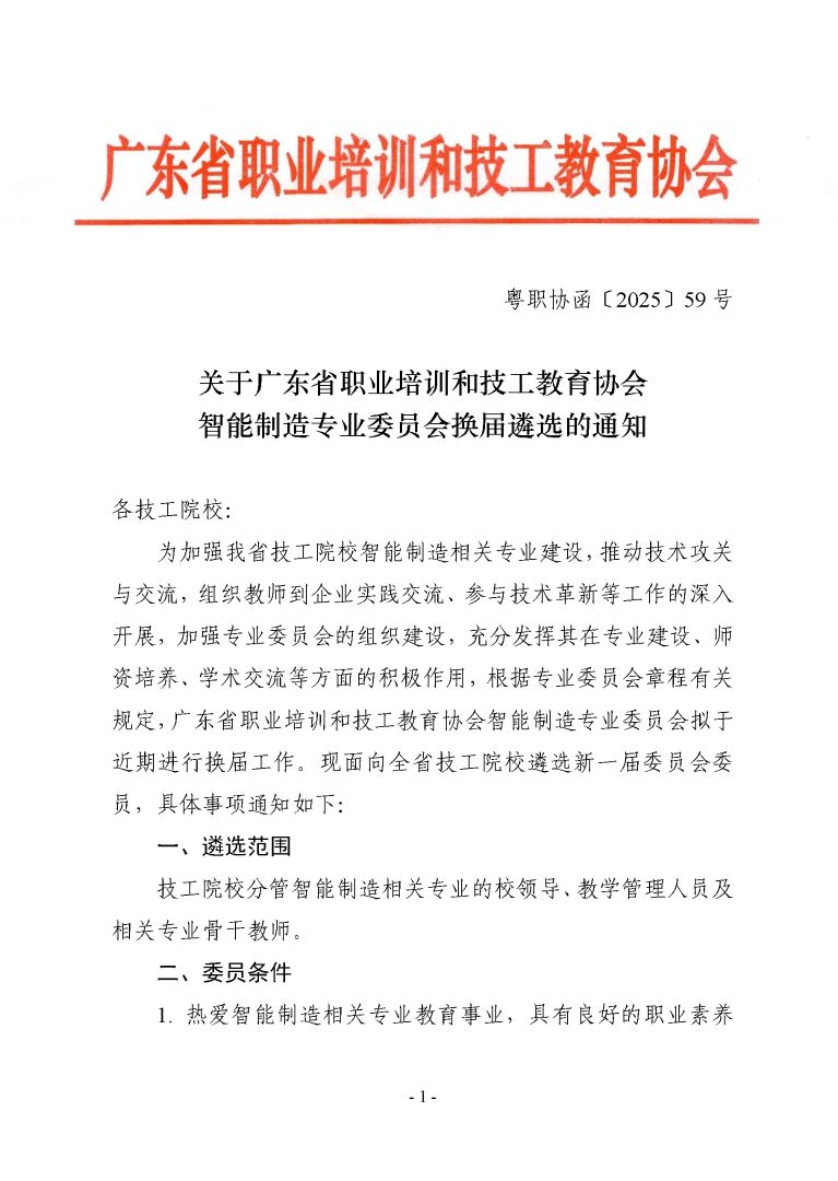 关于广东省职业培训和技工教育协会智能制造专业委员会换届遴选的通知(粤职协函〔2025〕59 号)