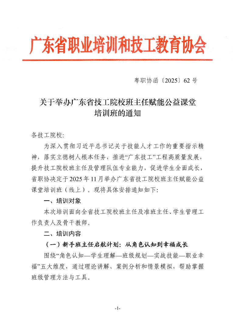 关于举办广东省技工院校班主任赋能公益课堂培训班的通知(粤职协函〔2025〕62 号)
