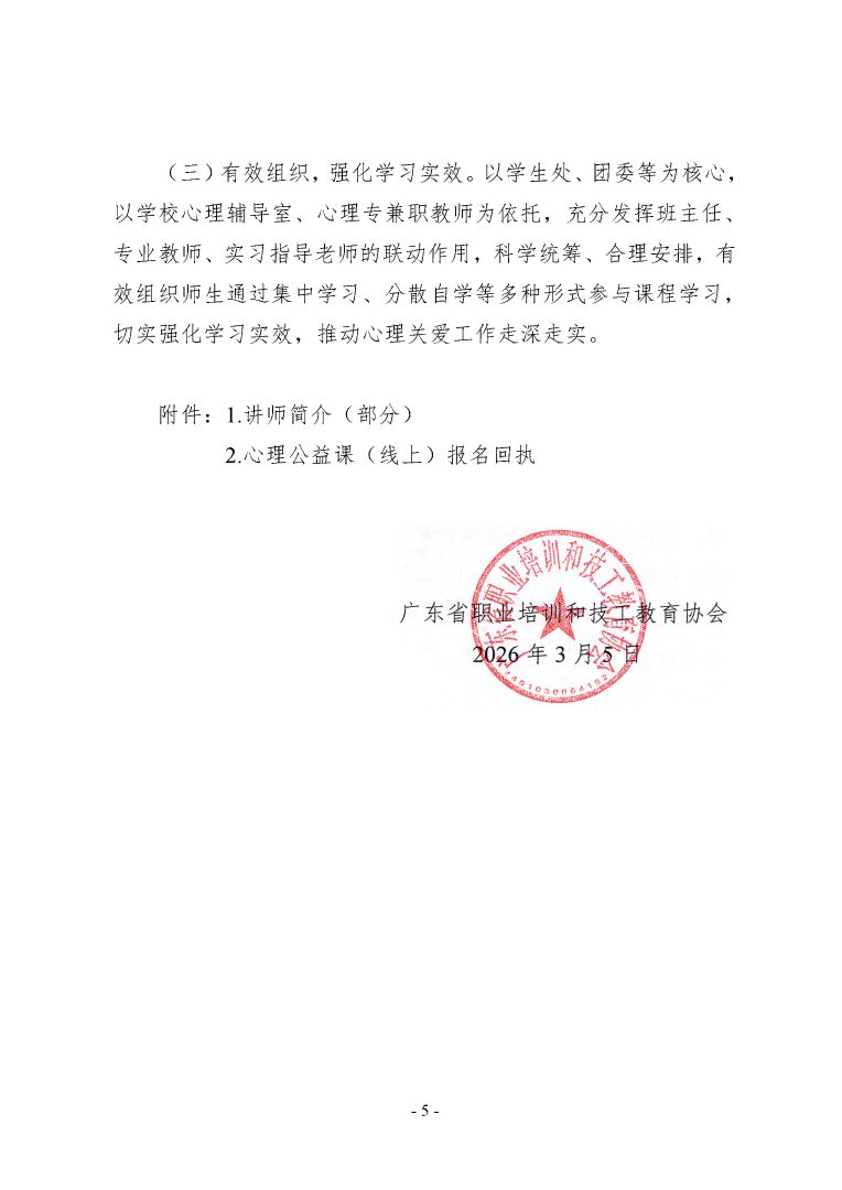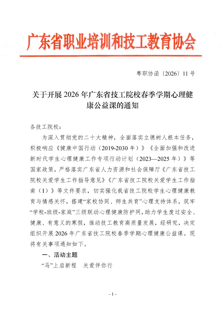 关于开展2026 年广东省技工院校春季学期心理健康公益课的通知(粤职协函〔2026〕11 号)