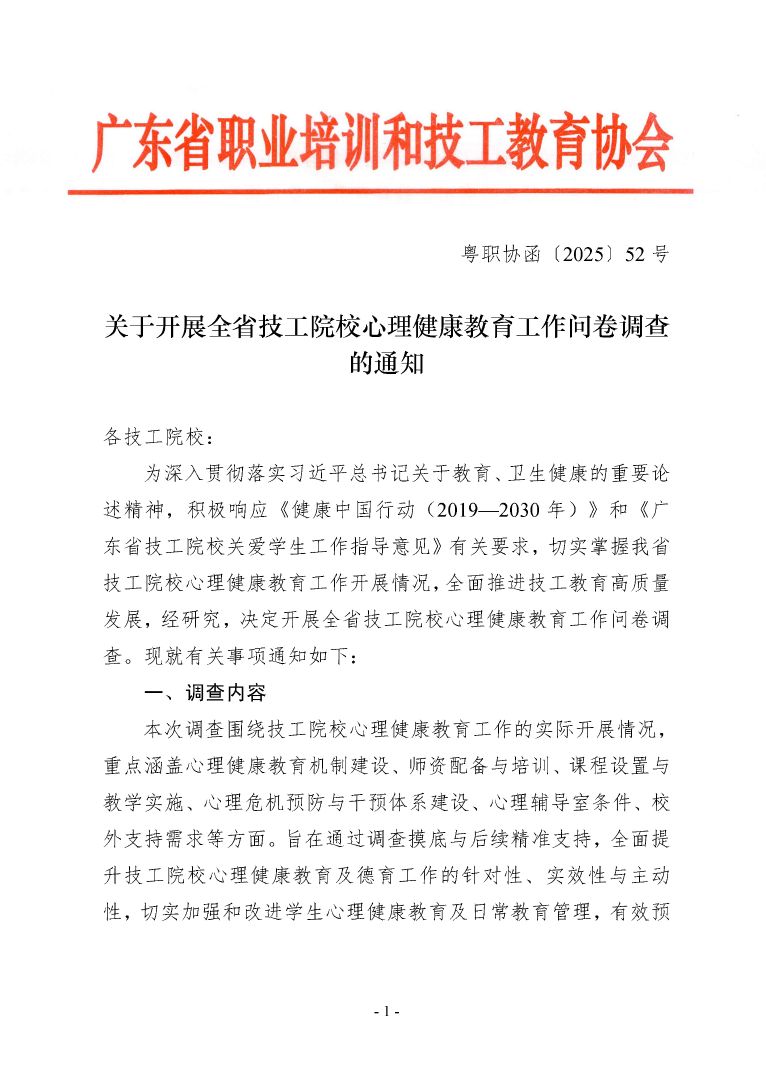 关于开展全省技工院校心理健康教育工作问卷调查的通知(粤职协函〔2025〕52 号)