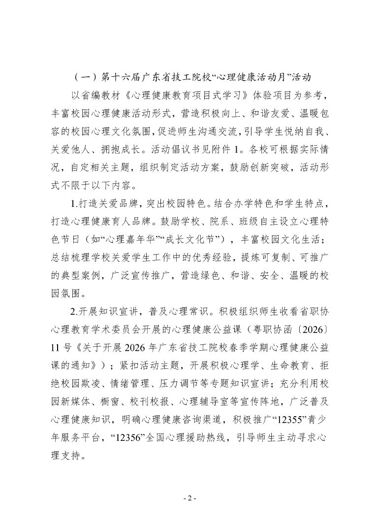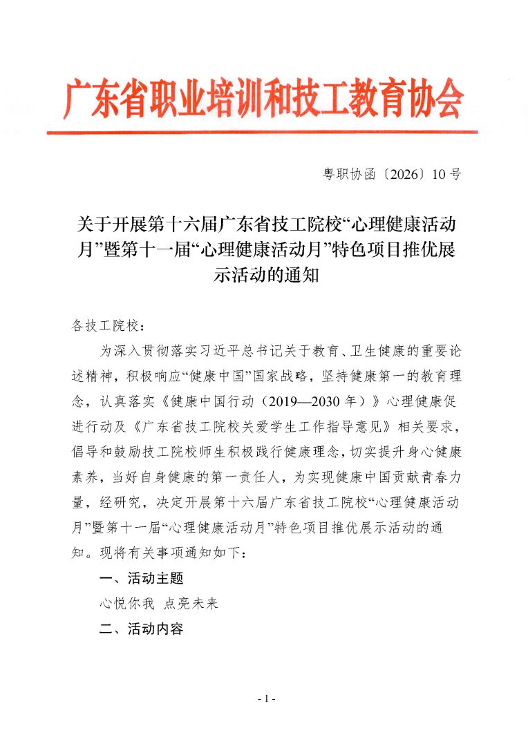关于开展第十六届广东省技工院校“心理健康活动月”暨第十一届“心理健康活动月”特色项目推优展示活动的通知(粤职协函〔2026〕10 号)
