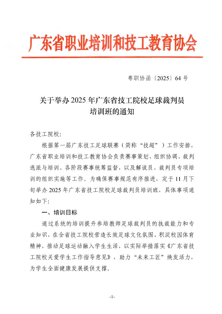 关于举办2025 年广东省技工院校足球裁判员培训班的通知(粤职协函〔2025〕64 号)